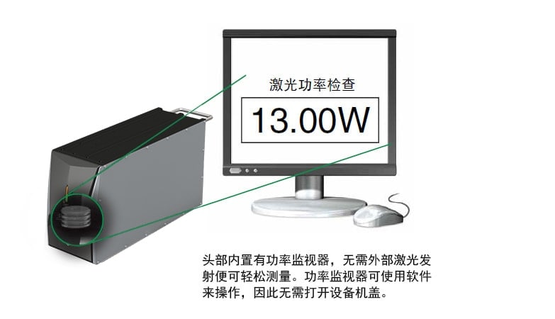 功率表可用于准确测量激光刻印机的输出功率(可从电子供应商处获得)。要测定当前的功率输出值,将激光束照射到功率表的头部(确保所有设备都没有运转)。KEYENCE 的 MD-X 系列 YVO4 激光刻印机标配有内置功率监视器,可供用户轻松、精确地测量激光输出功率,而无需购买外部设备。