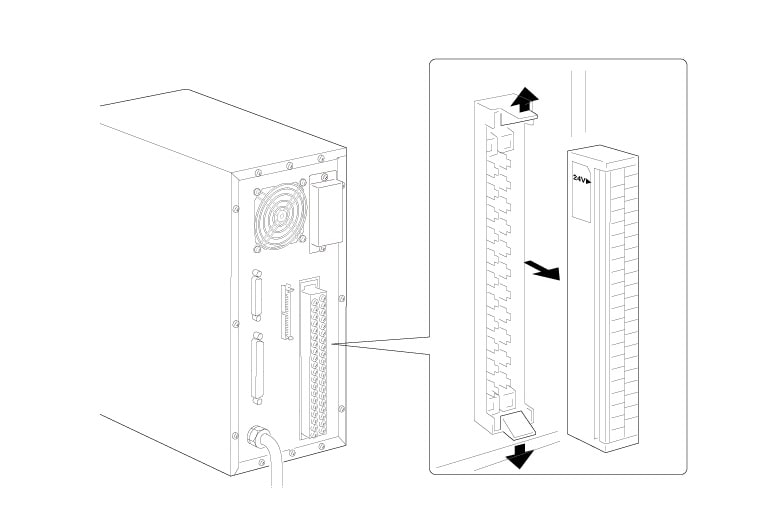 是的,控制器的后面板配备了一个端子台和一个MIL接口,让用户能把传感器,PLC 或控制装置与激光刻印机连线。通过预先寄存的刻印设定,用户能利用 I/O 端子切换刻印类型。只用 I/O 端子就能实现多种控制。松开上下端的锁扣就能拆卸端子台。