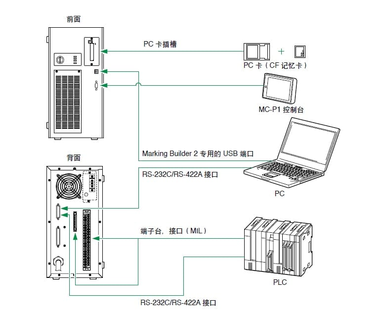 是的,激光刻印机能通过从 PC 或 PLC 发送连续的通信指令进行控制。