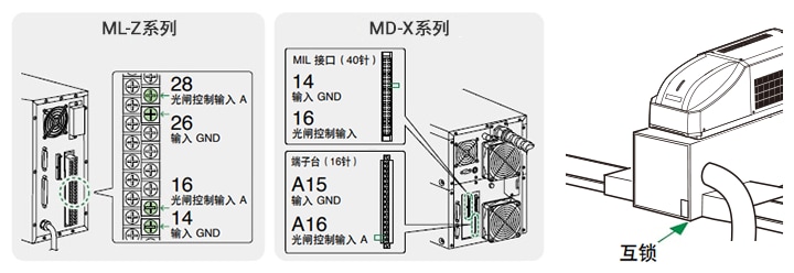* ML-Z 和 MD-F 和 MD-X系列是通过单一电路进行控制:激光控制输入端子(端子号 10)。