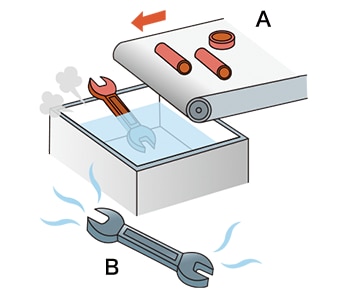 - 使钢变得刚硬的热处理。普通的钢加热至约700°C时,材料会变红,晶体结构和性质开始发生变化。这种性质变化被称为“相变”,变化开始的温度被称为“相变温度”。所谓淬火,是指在超过相变温度的温度下,将铁的晶体转变为碳可以大量溶解在内的奥氏体,将碳固溶到铁的晶体中,然后用水或油进行快速冷却,由此转变为马氏体这一非常硬的晶体的热处理。