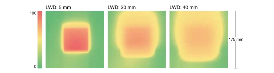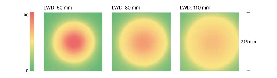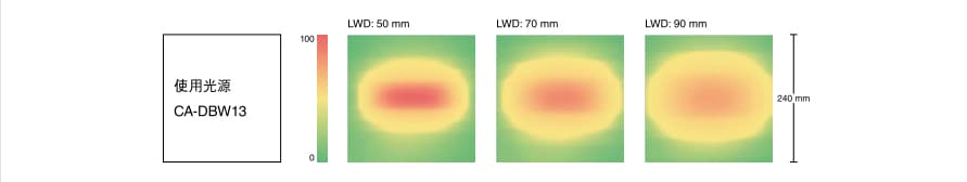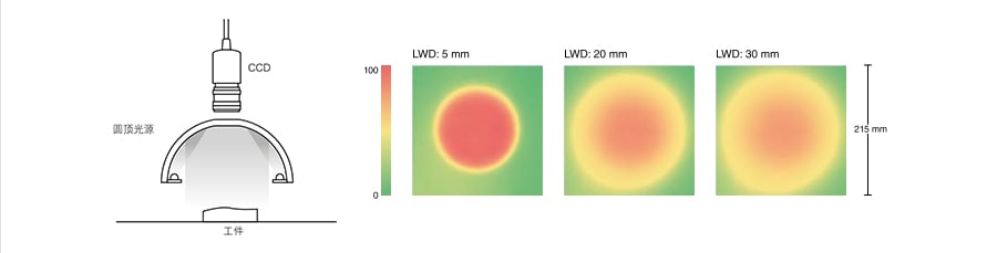 随着光源距离产品的工作距离LWD变化而产生的亮度分布,如下图暖色表示亮;冷色表示暗。