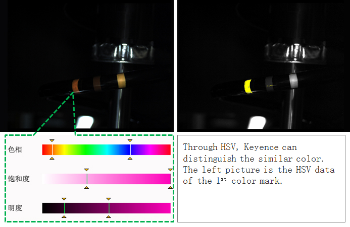 然后通过HSV功能对相近的颜色进行准确的提取。如左图即为第一色块的HSV参数,从而可以对相近颜色进行准确区分。