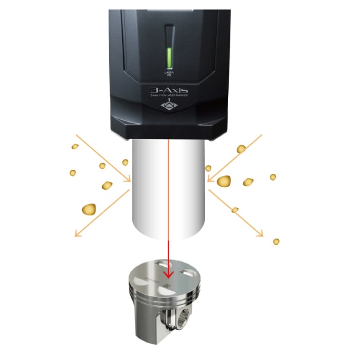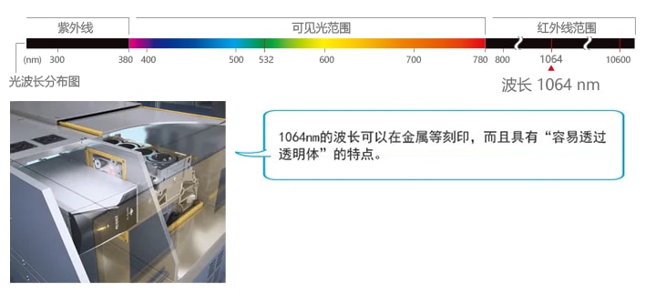在刚铸造好的产品上刻印本身是几乎没有问题的。但如果产品温度有几百度,其周围的环境温度也会上升,会大大超出激光刻印机的使用环境温度,无法直接使用。这种情况也有很好的解决方法。就是在产品和激光刻印机之间插入耐热玻璃即可。通常,刻印金属时一般使用波长为1064nm的YVO4激光或YAG激光,而这个波长的激光具有“容易透过透明体”的特点,所以可以这样安装。