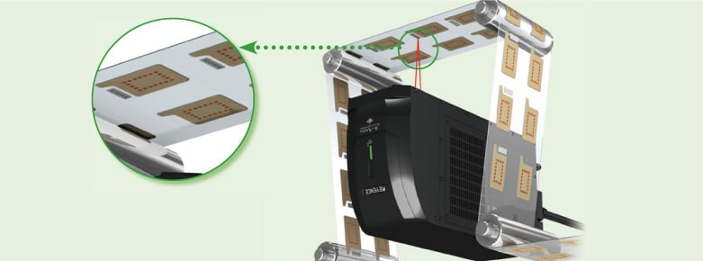 - 可在产品移动的过程中刻印,因此不需要停止生产线。可一键切换品种,提高了生产效率。
