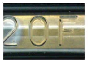 通过将玻璃表面略微熔化的方法进行刻印。由于该材质具备耐热性,可实现不产生裂纹的激光刻印。