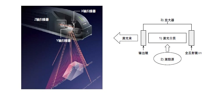 - 激光束在全反射镜和输出镜之间被放大,然后通过 f-theta 镜头,在目标物体表面聚集。