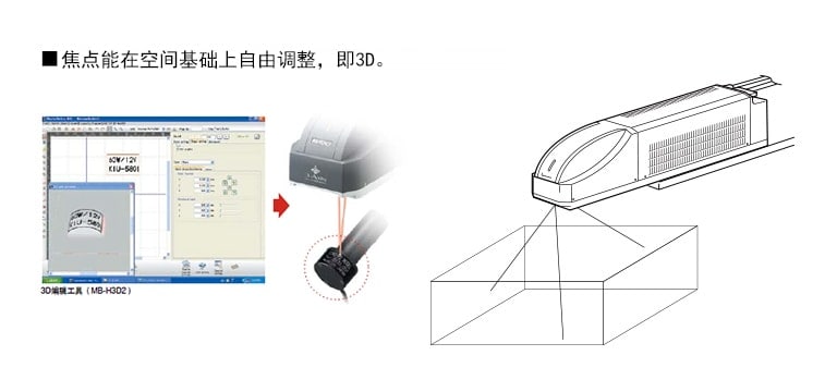 用于三轴控制激光刻印机的术语“刻印空间”就是指用于2D控制激光刻印机的术语“刻印区域”。2D控制激光刻印机只能进行2D刻印,即“区域”。另一方面,三轴控制激光刻印机提供了一个体积或“空间”的概念,因为焦点是不断变化。所以,对于三轴控制激光刻印机,要用“空间”表达,而不是“区域”。