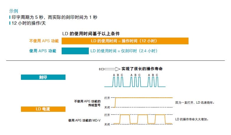 KEYENCE 的激光刻印机仅在刻印时使用激光二极管(LD)。这是因为激光刻印机配备了自动节电(APS)功能,他能在不刻印时自动降低 LD 光源的水平。由于只是降低电流,LD 的电源并没有关闭,所以系统几乎瞬间即可恢复整体的刻印能力。