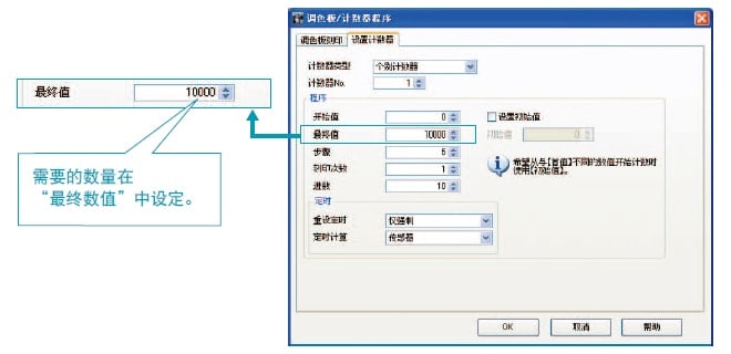 端子台上的“计数设定”和“计数输出”可以用来验证刻印产品的精确数字。在“计数设定”中设定需要刻印产品的数量作为“最终数值”。这样当达到最终数值时,激光刻印机会输出一个信号。该输出信号即可用来终止生产,发出警报声等。