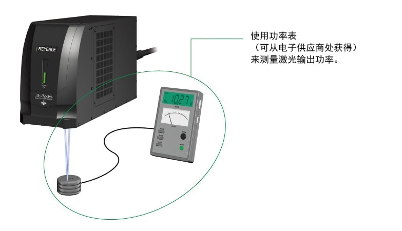 功率表可用于准确测量激光刻印机的输出功率(可从电子供应商处获得)。要测定当前的功率输出值,将激光束照射到功率表的头部(确保所有设备都没有运转)。KEYENCE 的 MD-X 系列 YVO4 激光刻印机标配有内置功率监视器,可供用户轻松、精确地测量激光输出功率,而无需购买外部设备。