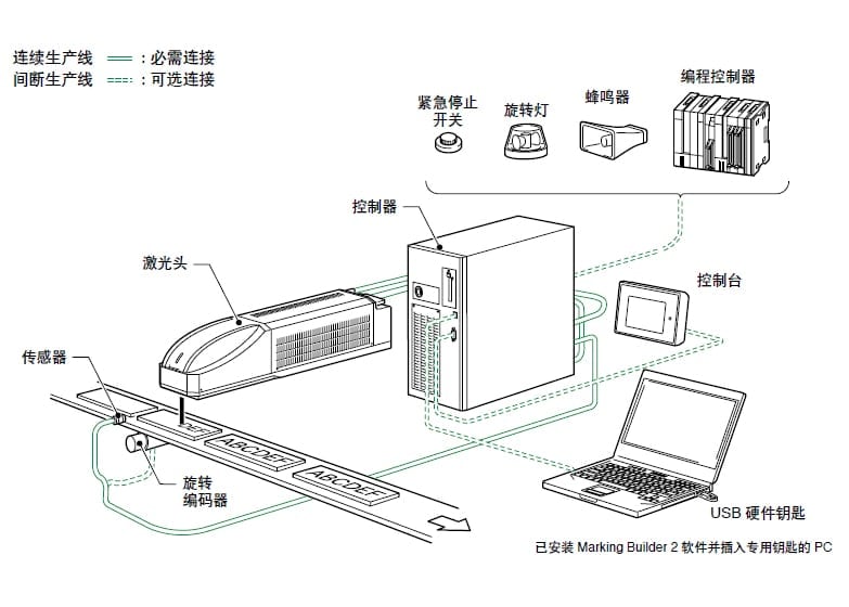 外部传感器会检测激光的发射,并发送一个输入信号到刻印机。如果刻印中刻印机没有接收到来自传感器的输入信号,就会输出一个错误信号。
