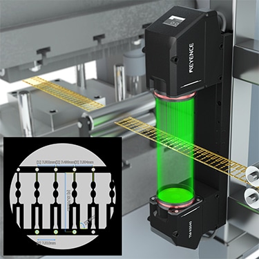 测量冲压后的端子部件的尺寸。冲压出现异常后立刻发现问题,可有效提高成品率。TM 系列是一款高速且可进行校正的测量仪,因此可保证全数检查和测量值。