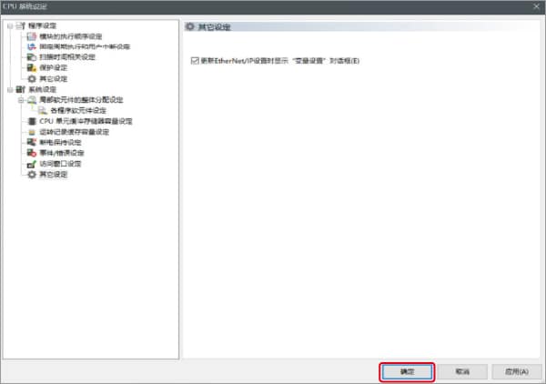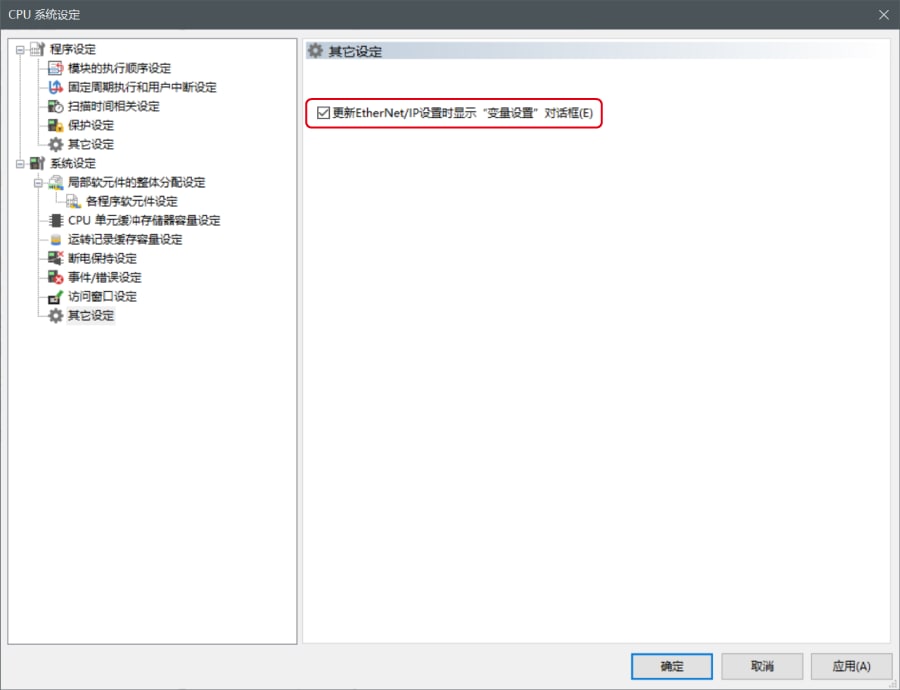给EtherNet/IP的连接分配变量时,在[CPU系统设定]对话框的“系统设定”的“其他设定”中勾选“EtherNet/IP设置更新时显示变量设置对话框(E)”。