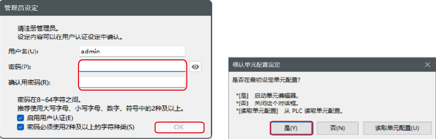 显示[管理员设定]对话框,输入密码后点击[OK],显示[确认单元配置设定]对话框,单击〔是(Y)〕。