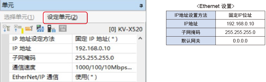 3.显示单元编辑器,在“设定单元(2)”选项卡中设置KV-X520的IP地址。在此,如下所示设置。