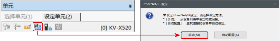 2.在单元编辑器上单击EtherNet/IP设定的图标。显示选择设置方法的对话框,单击〔手动(M)〕。