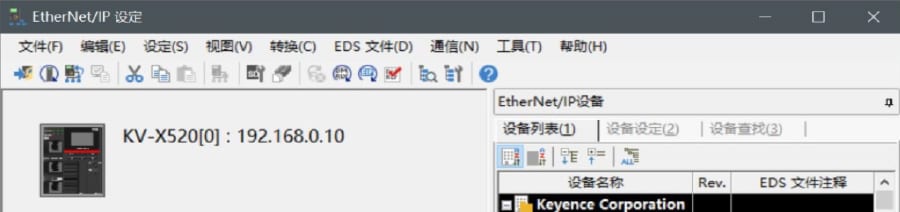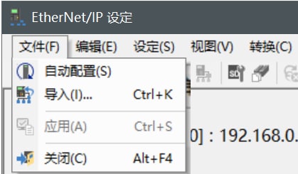 5. 在用Ethernet电缆连接了KV-X 系列IV4 系列的状态下,选择[EtherNet/IP设定]窗口的【文件(F)】→【自动配置(S)】。