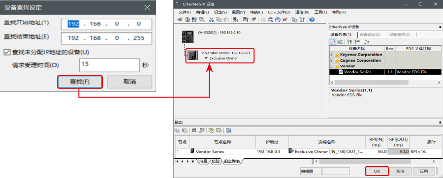 7.项目传输完成后,显示[设备查找设定]对话框,单击〔查找(F)〕。自动配置完成后,IV4 系列会自动注册,单击〔OK〕关闭[EtherNet/IP设置]窗口。
