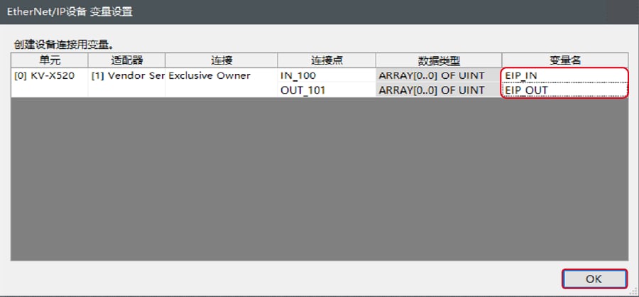 勾选“EtherNet/IP设置更新时显示变量设置对话框(E)”后,即更新EtherNet/IP设置,当确定了单元编辑器的更改内容时,即显示给连接分配变量的对话框。