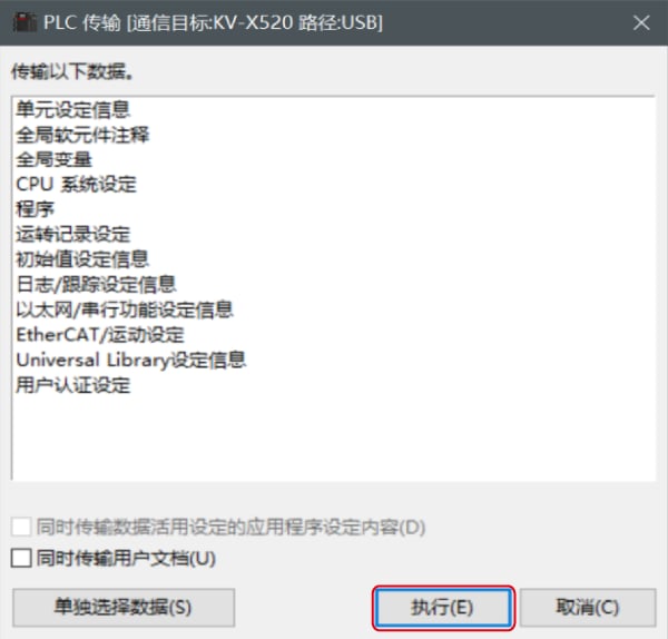 在[PLC传输]对话框中单击〔执行(E)〕。