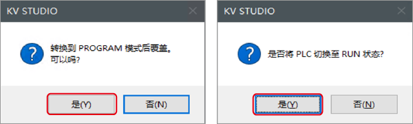 6.实机和单元编辑器的配置不同时,会显示确认项目传输的对话框,在用USB电缆连接了PC和KV-X 系列的状态下单击〔是(Y)〕。