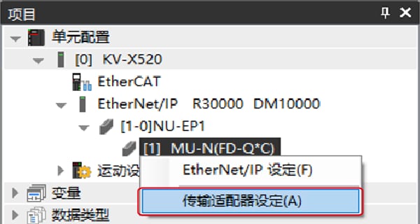 1. 在工作空间中展开单元配置。右键点击MU-N(FD-0*C)并选择[传输适配器设定(A)]