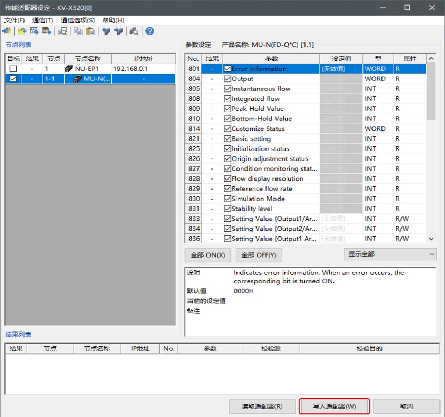 点击 [写入适配器 (W)] 将设定值写入传感器。
