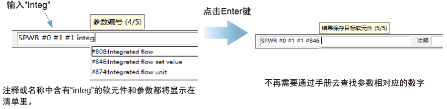 当您使用梯形图程序时,您可以直接将软元件注释或者参数名输入到自动搜索并显示输入候选项。