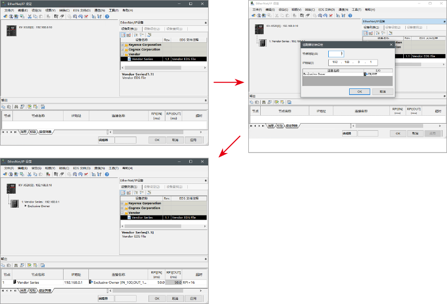 设置设备配置的方法在"EtherNet/IP设定"的[设备列表(1)]选项卡中,拖放“Vender Series”并创建设备配置。
