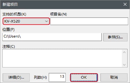 1.启动KV STUDIO,新建项目。支持型号选择“KV-X520”,单击〔OK〕。