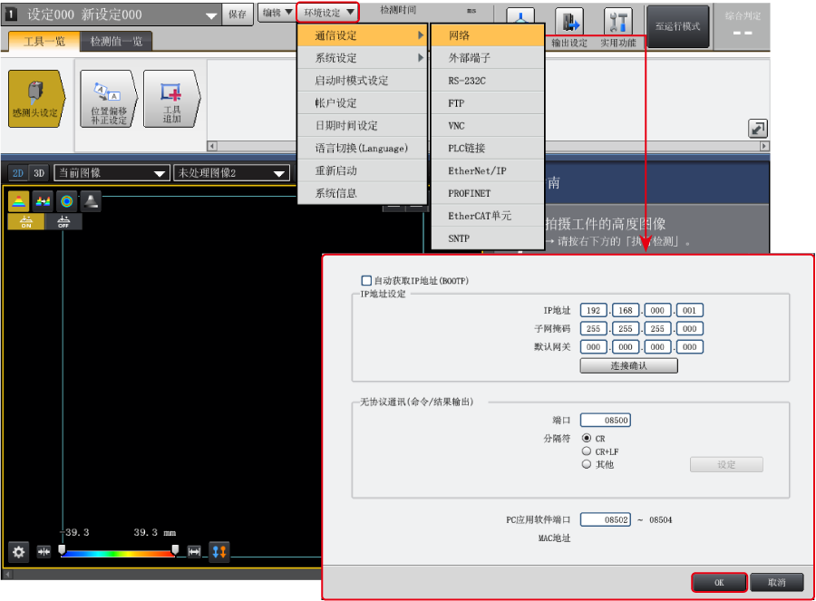 1. 在LJ-S8000系列的设定画面中选择【环境设定】→【通信设定】→【网络】。进行以下网络设定,点击〔OK〕。
