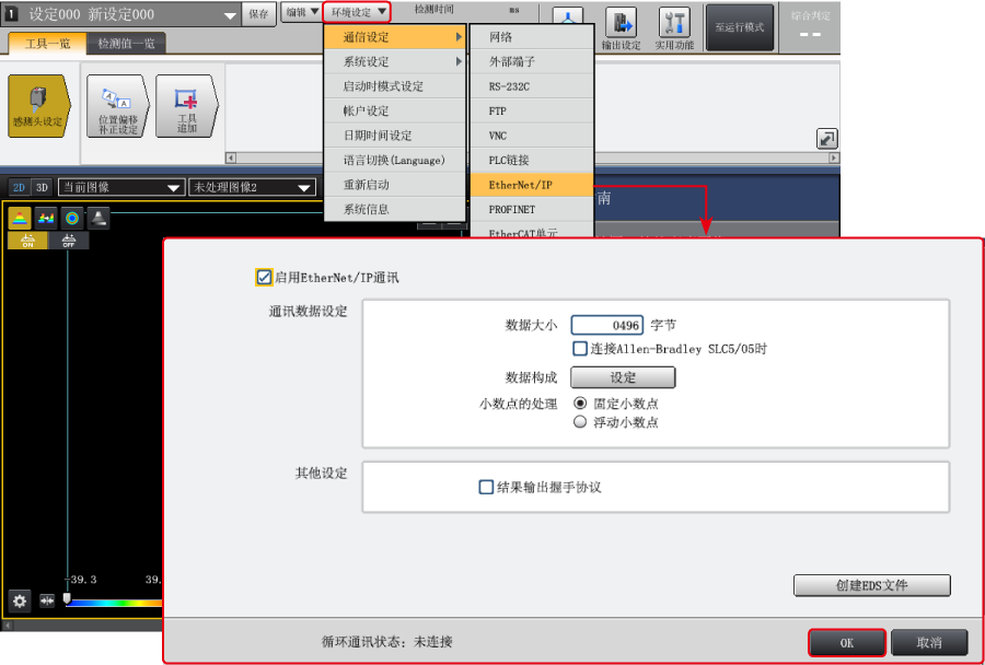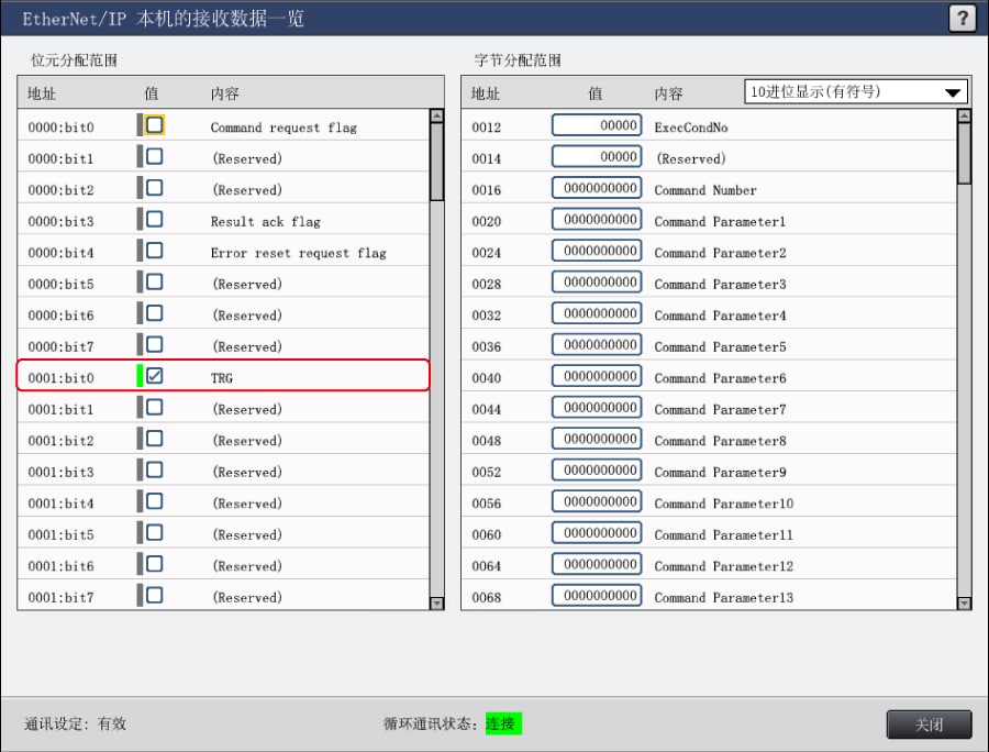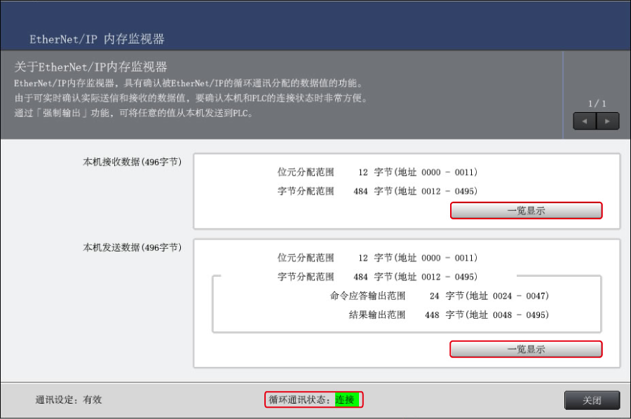 通过控制器的“环境设定”选择“输入输出设定”- “EtherNet/IP”,确认“EtherNet/IP”画面下部的“循环通信状态”。此处显示“未连接”时,表明通信失败。请重新确认连接线的连接状态、IP 地址、PLC 侧的通信设定等。