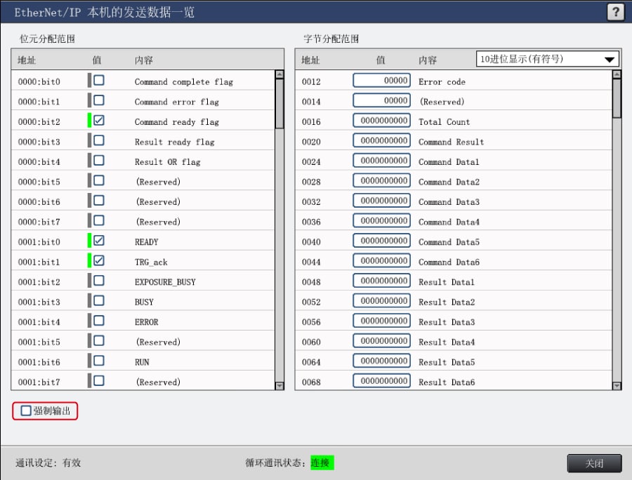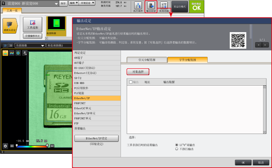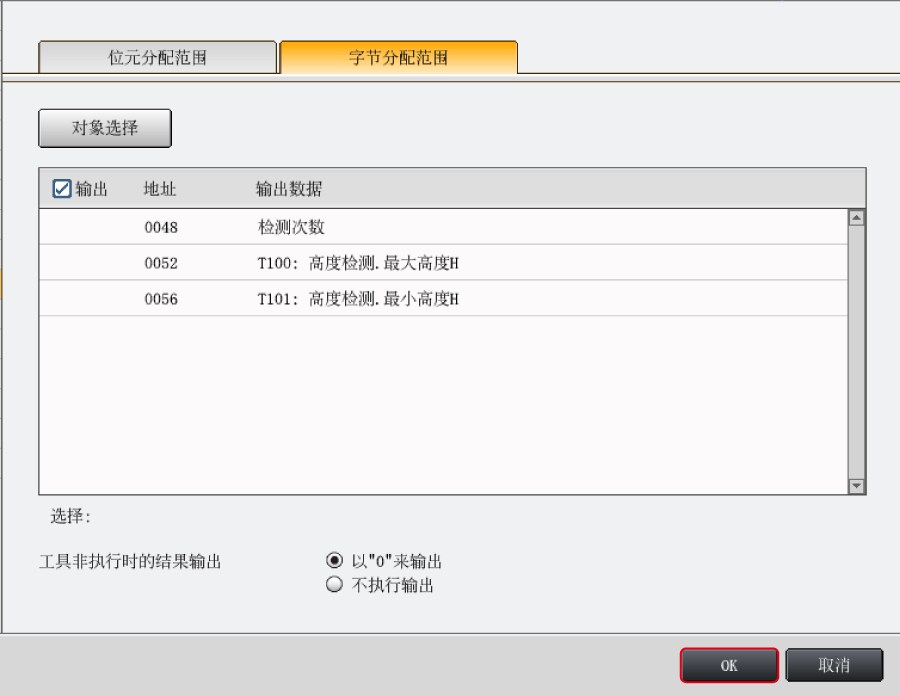 - *要获取综合判断OK 等位元信息时,请选择【位元分配范围】,按照同样步骤将位元信息分配至EtherNet/IP 通信的输出范围。