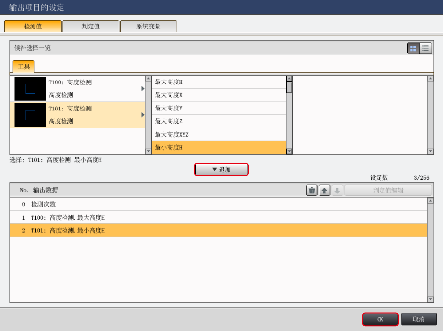 4. 在“工具”中选择预先设定的工具。显示可通过所选工具进行测量的参数,选择想要通过EtherNet/IP 通信获取的参数,通过〔追加〕进行选择,点击〔OK〕。