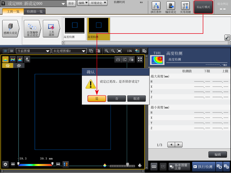 6. 选择【至运行模式】。显示[ 确认] 对话框后,点击〔是〕,保存设定后将控制器切换至运行模式。