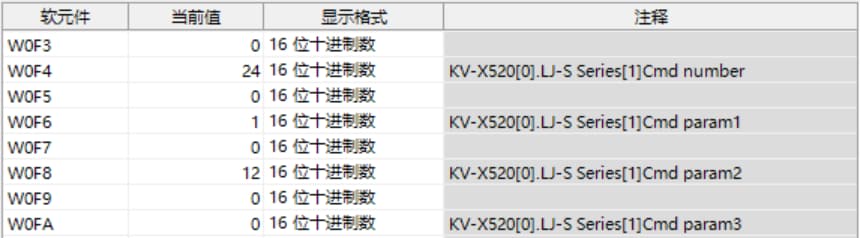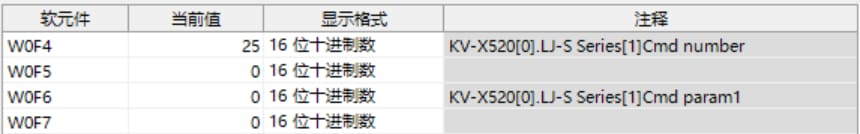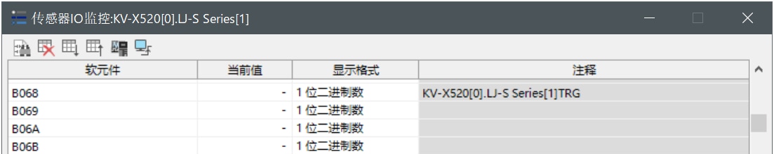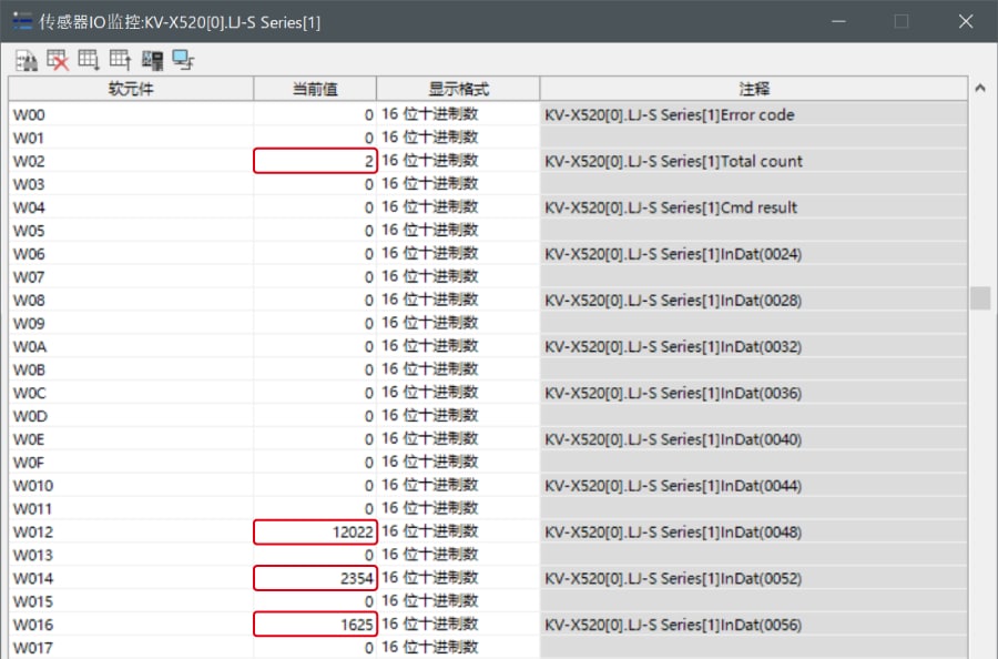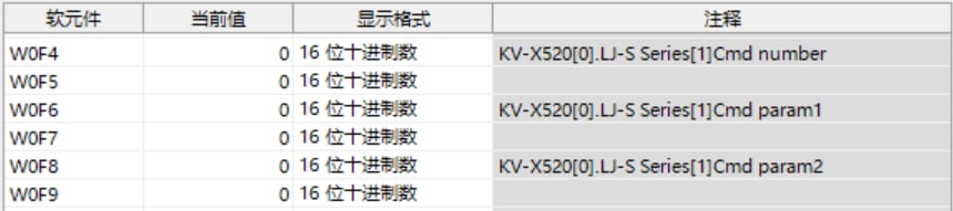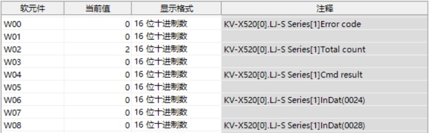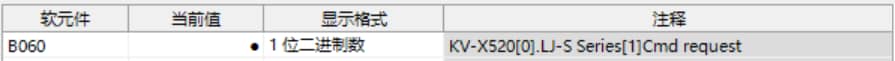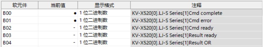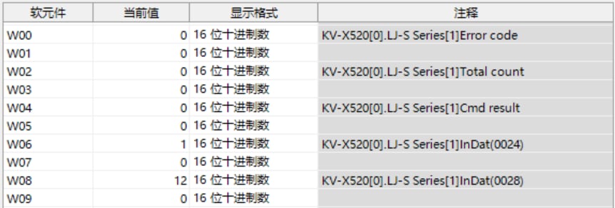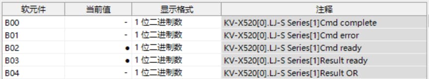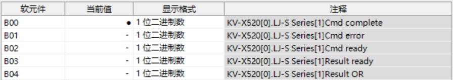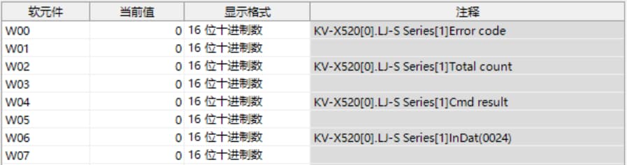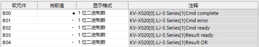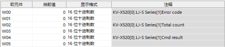 KV-X 系列针对第 1 台的LJ-S 系列使用了自动分配时, LJ-S 系列的结果数据将被写入到链路寄存器W0012 以后。