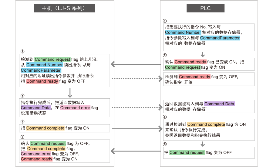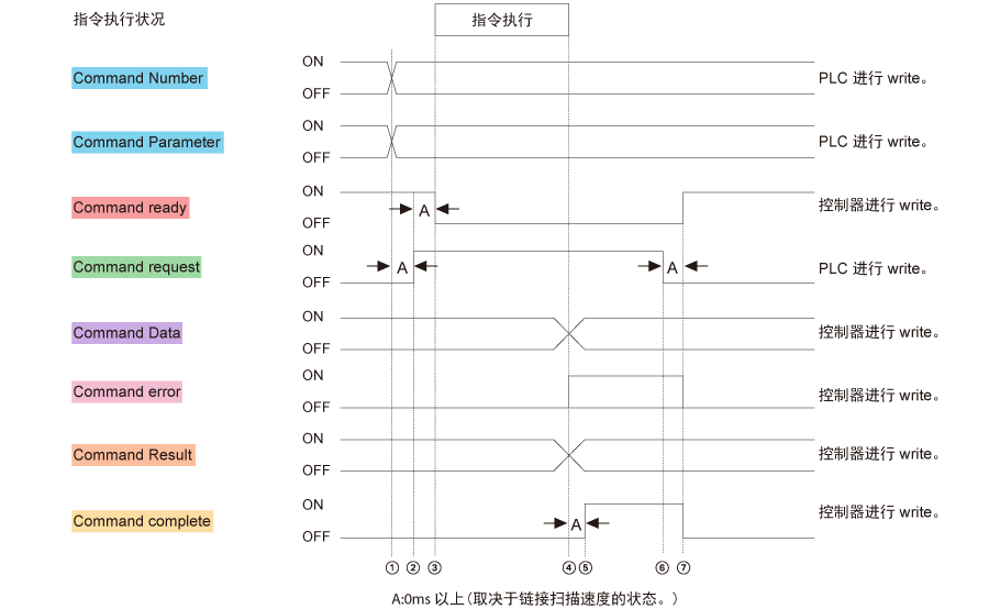 - 指令失败时 :Command complete(B000) 变为“1”、Command error(B001) 也变为“1”。另外,向 Command result(W004) 写入错误代码。
