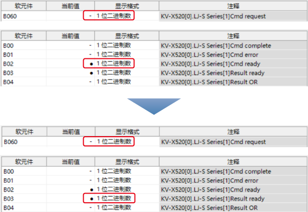 - 指令成功时 :Command complete(B000) 变为“1”、Command error(B001) 变为“0”。